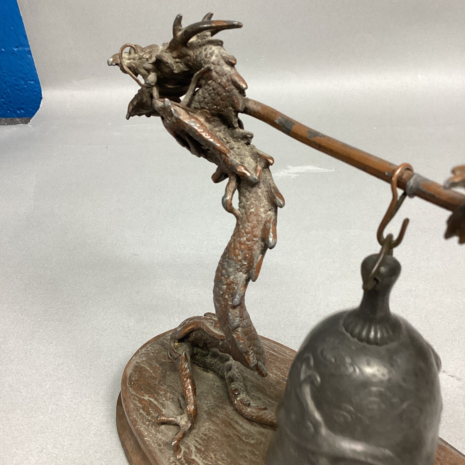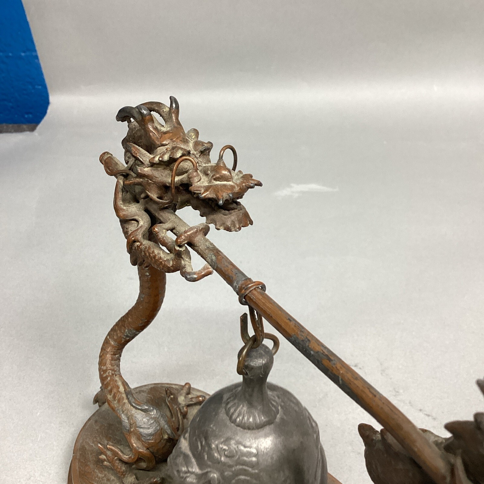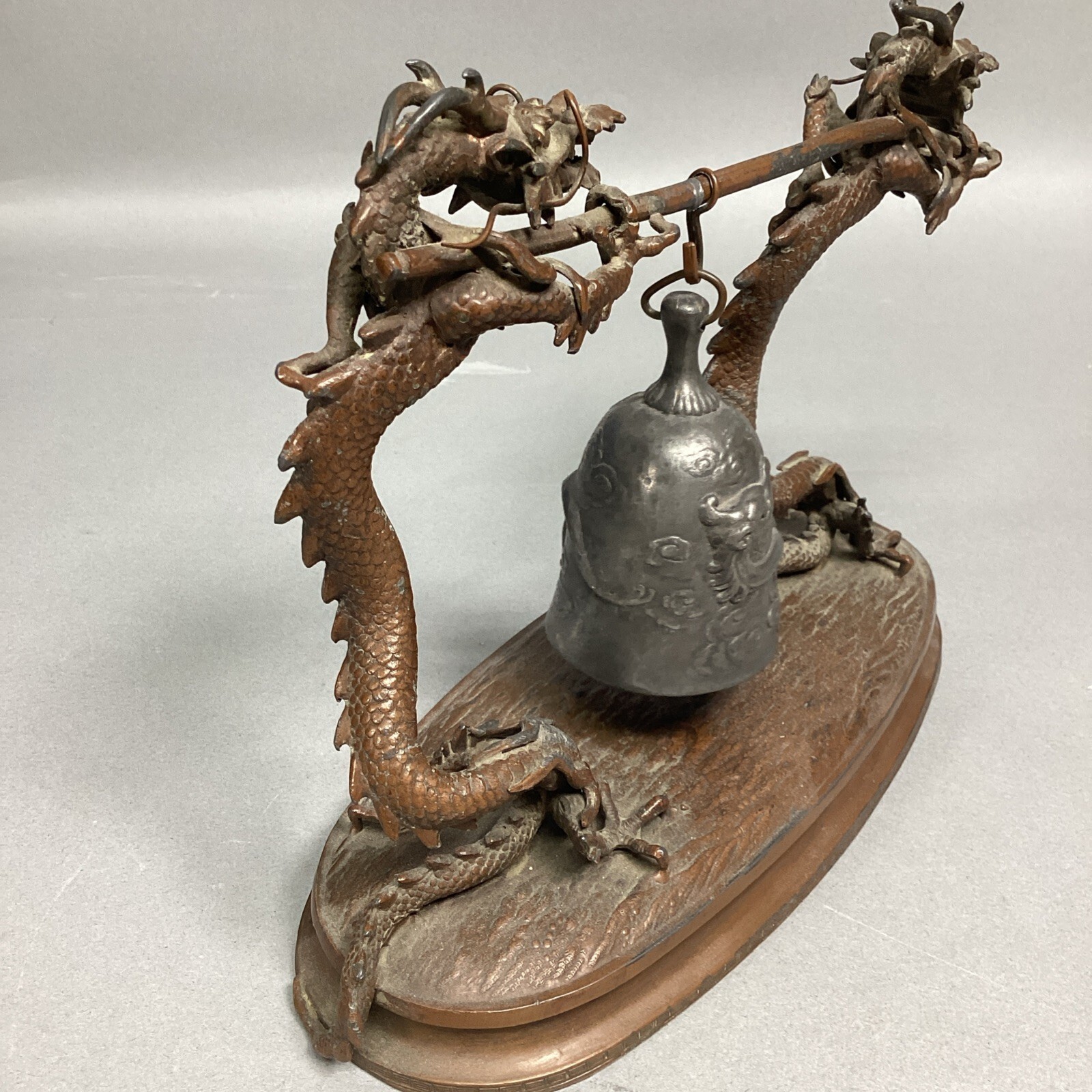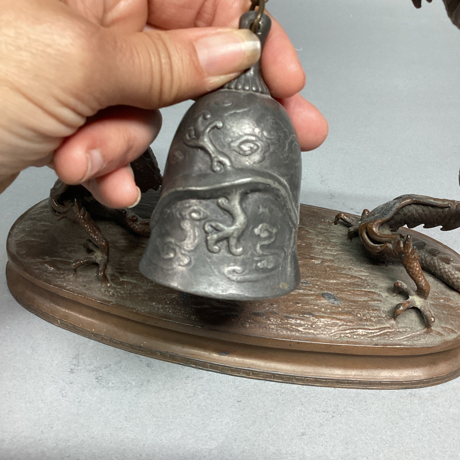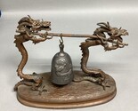 - Vintage Chinese Bronze Dragons W/ Suspended Bell Statue Figurine - 8.5x3.5x7”