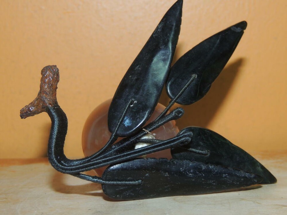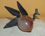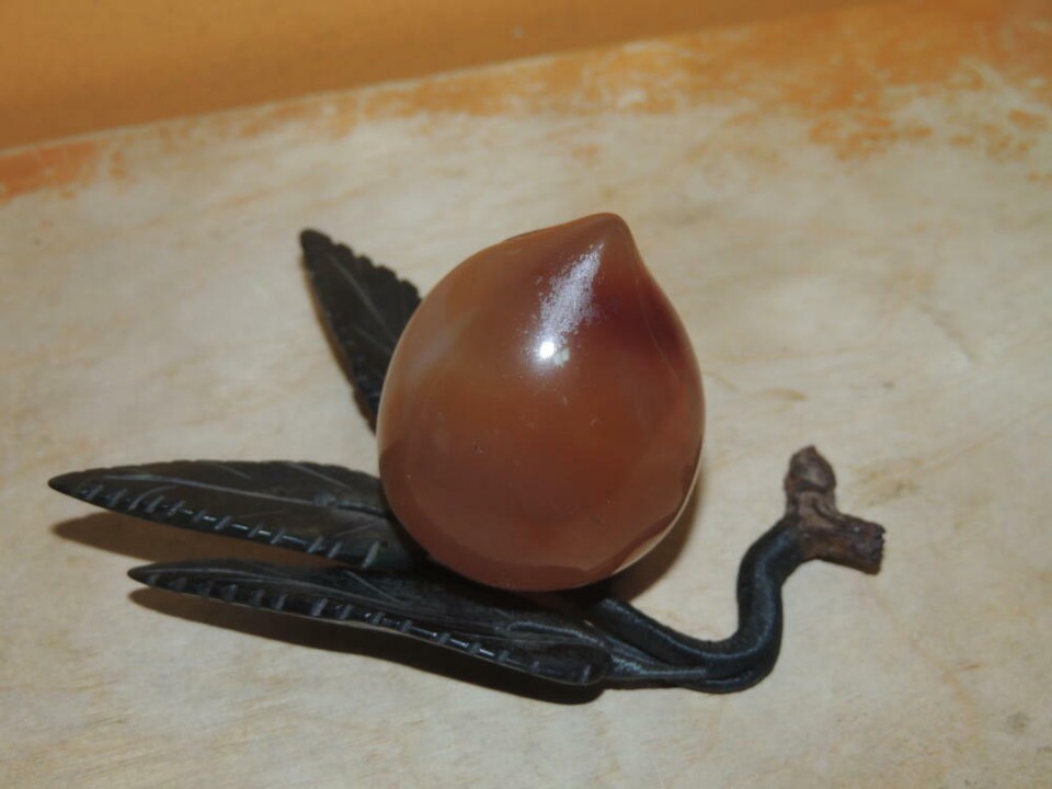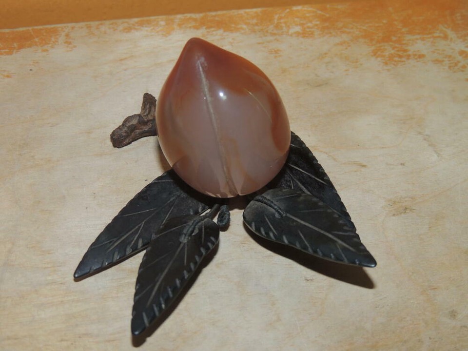 AGATE PEACH ON THE BRANCH, THE BRANCH IS DEFINITELY MAN MADE, BUT IT IS AN EXCELLENT REPLICA OF PETRIFIED WOOD. I AM NOT AN EXPERT BUT RESEARCH INDICATES THIS IS POSSIBLY CARNELIAN WITH GENUINE JADE LEAVES. PLEASE LOOK AT THE PICTURES CAREFULLY.