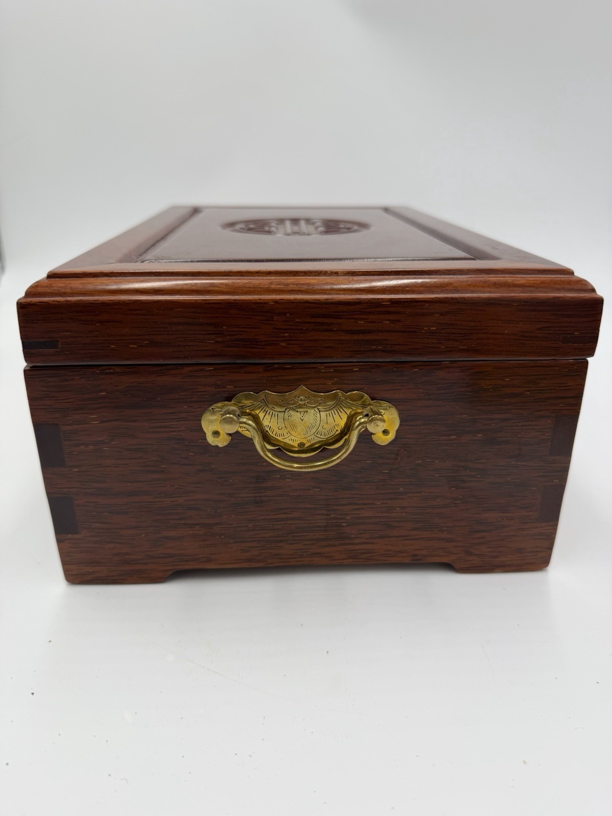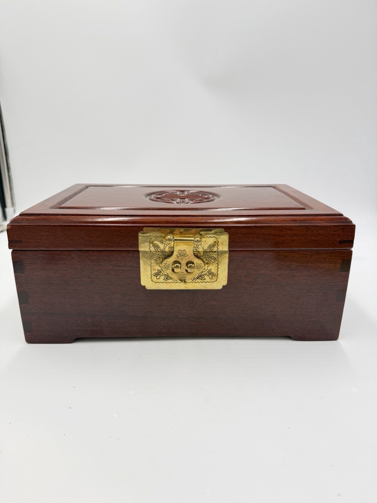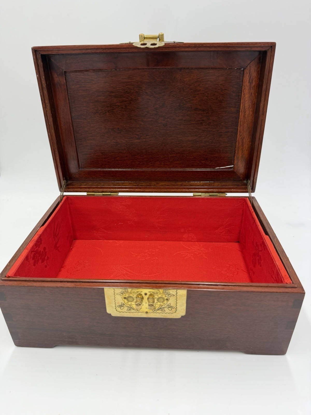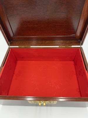 - Vintage Chinese Jewelry Carved Rosewood Brass Accents Red Lining Jewelry Box