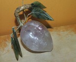 QUARTZ PEACH ON THE BRANCH, THE BRANCH IS DEFINITELY MAN MADE, BUT IT IS AN EXCELLENT REPLICA OF PETRIFIED WOOD. I AM NOT AN EXPERT BUT MY RESEARCH INDICATES THIS IS POSSIBLY ROSE DE FRANCE AMETHYST WITH GENUINE JADE. PLEASE LOOK AT THE PICTURES CAREFULLY.