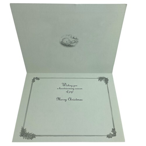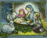 Featuring a nativity scene with children gazing at a baby in the cradle as white fluffy lambs look on. It's a snowy night in the manger.