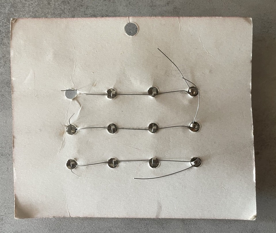 New-old stock, still attached to the original advertising display card. The card has wear, creasing, and surface marks from age and storage, but the bells are unused and shiny. Sold as pictured.