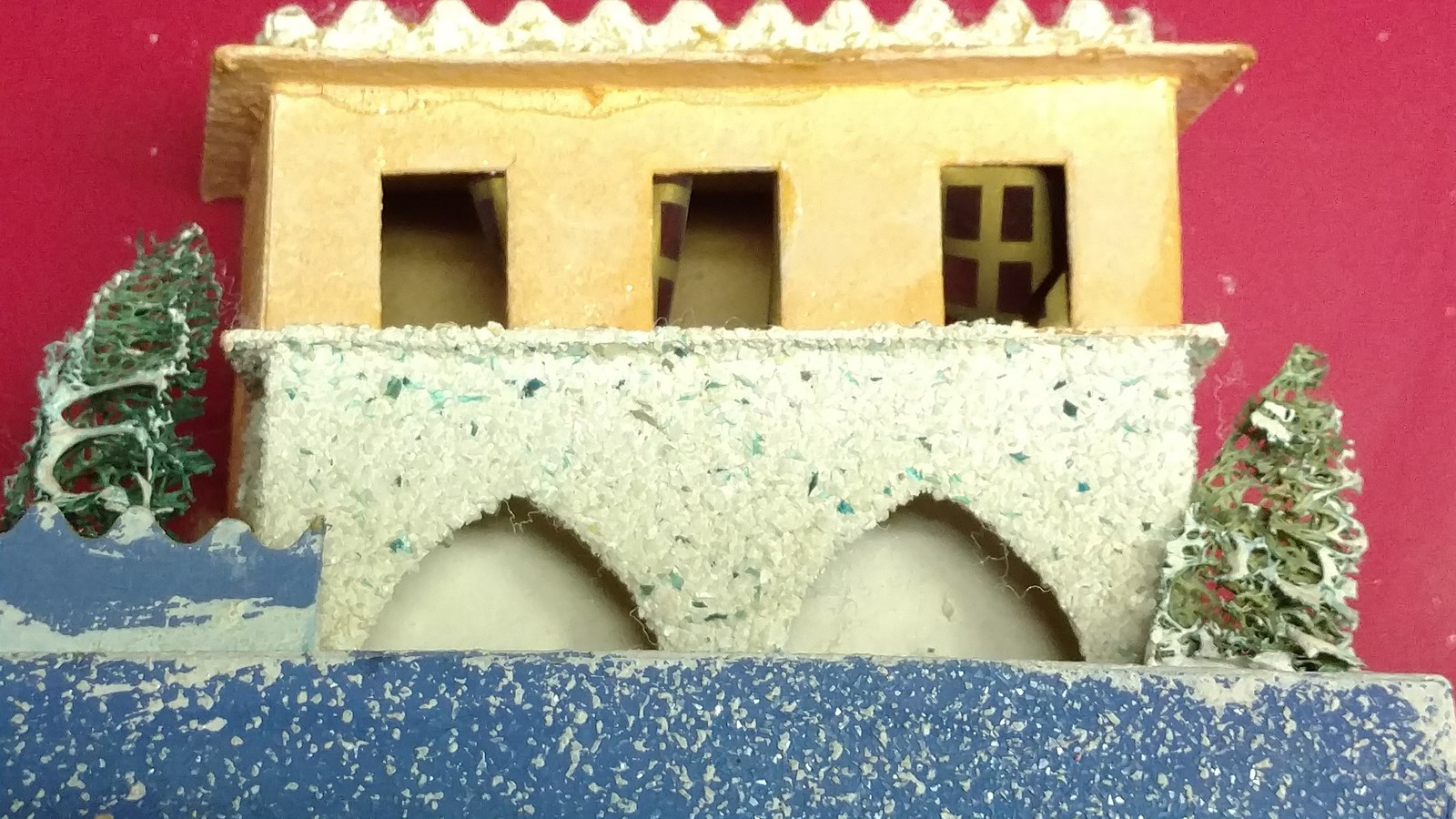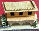 1920's cardboard paper mache Christmas village house features a double arched outer patio wall, a second story, with a flat roof with Spanish house style details, and three upstairs windows.