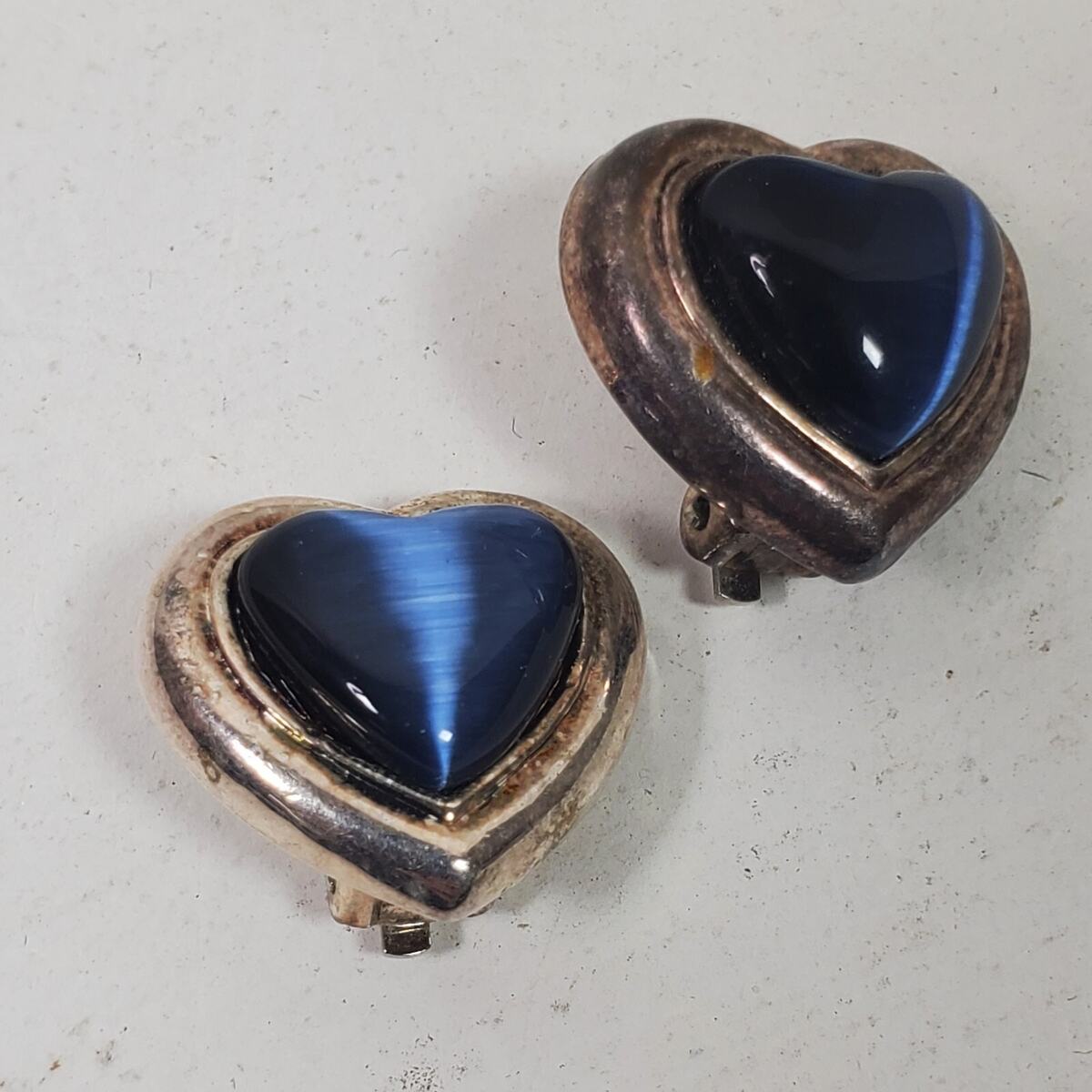 - Vintage Clip Earrings Hearts Blue w/ Silver Tone Edge .75 Inch