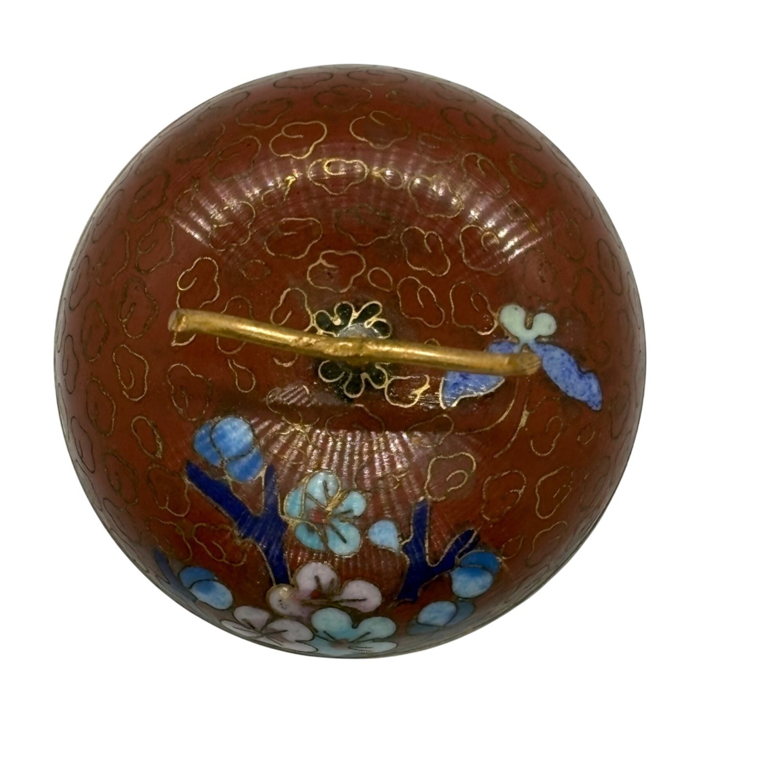 Decorative and functional, this intricately designed cloisonne trinket box features a floral motif, vibrant enamel interior, and charming apple shape.