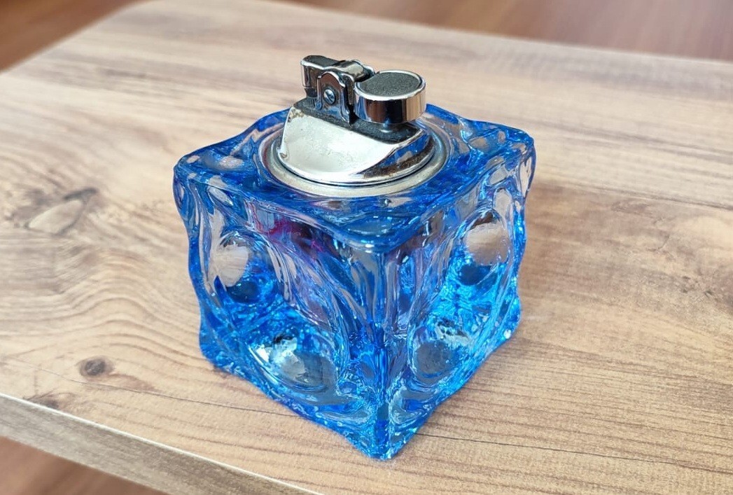 Featuring a cube-shaped, textured glass body with bubble-like impressions and a chrome-plated lighter mechanism, this piece perfectly combines function and style.