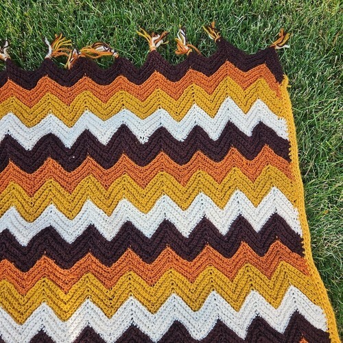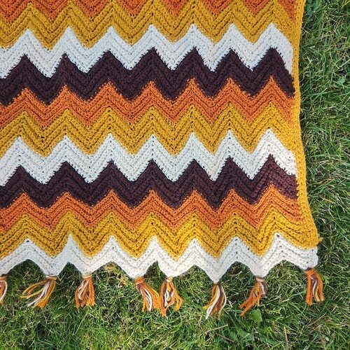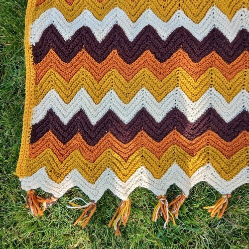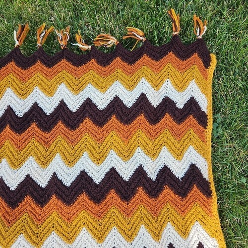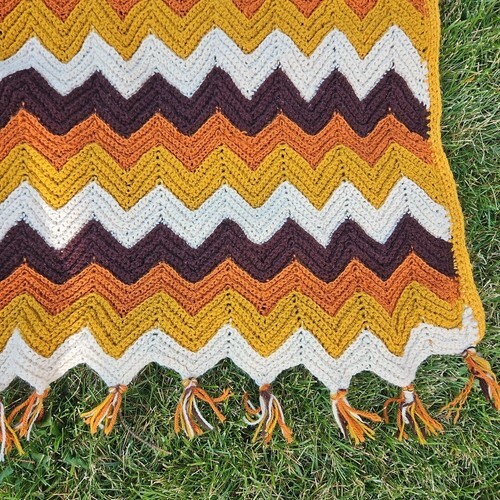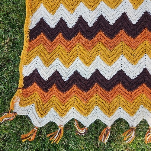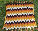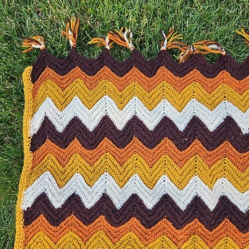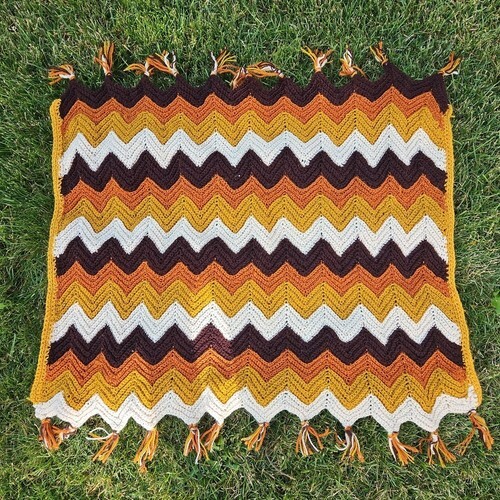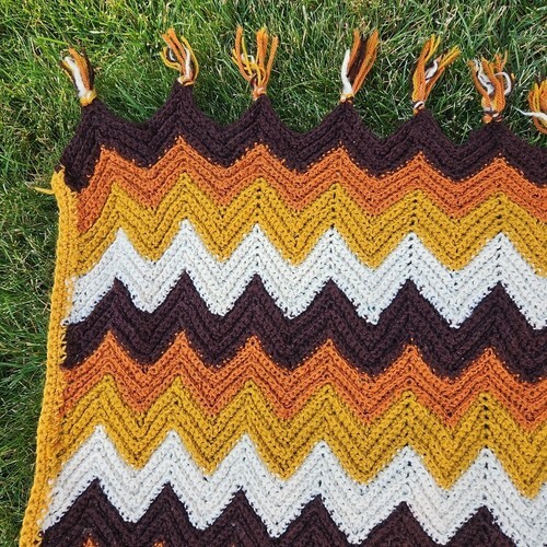 - Vintage Crochet Afghan Brown Chevron Blanket 36 x 33 Tassel Fringe Handmade