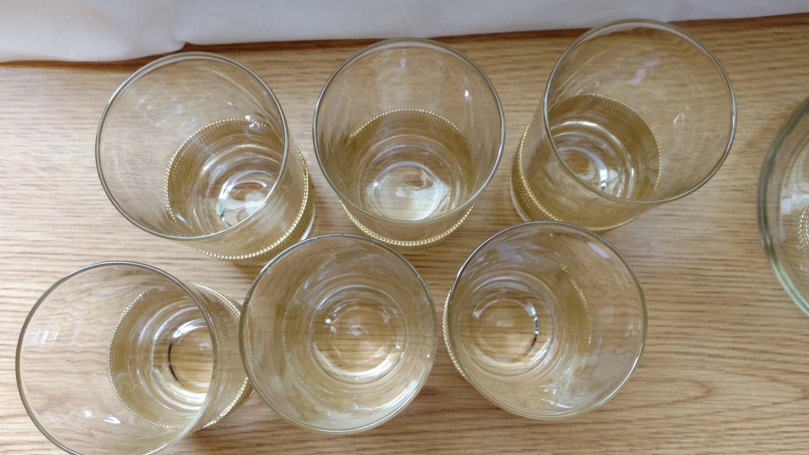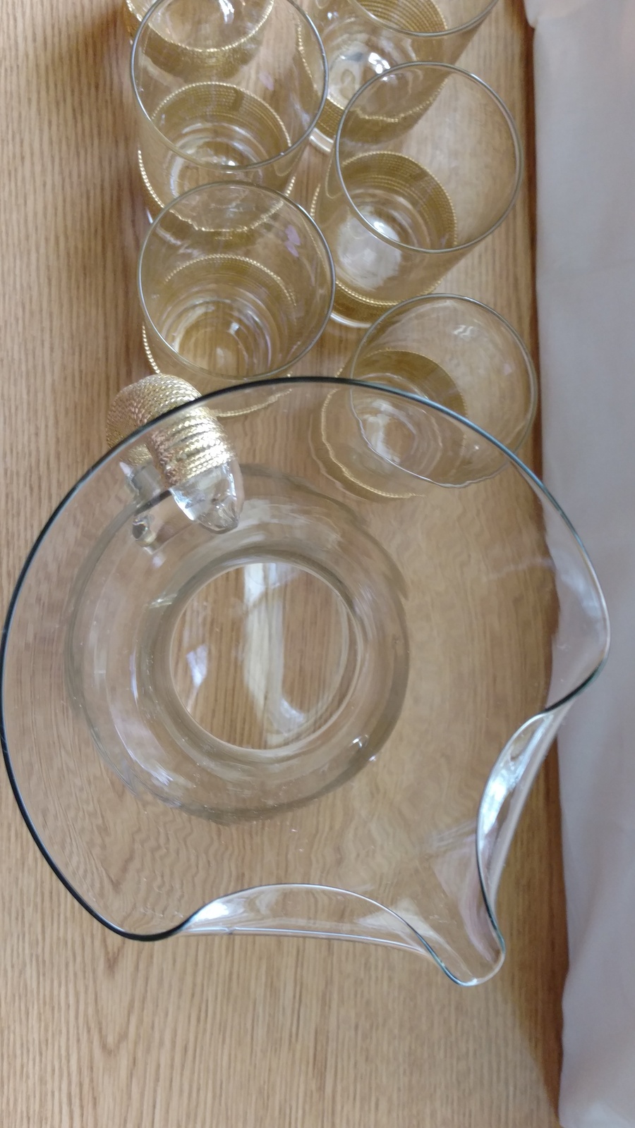 - Vintage Crystal Glass Pitcher 6 Glasses Gold Cord Dtails Mint Condition 1950's