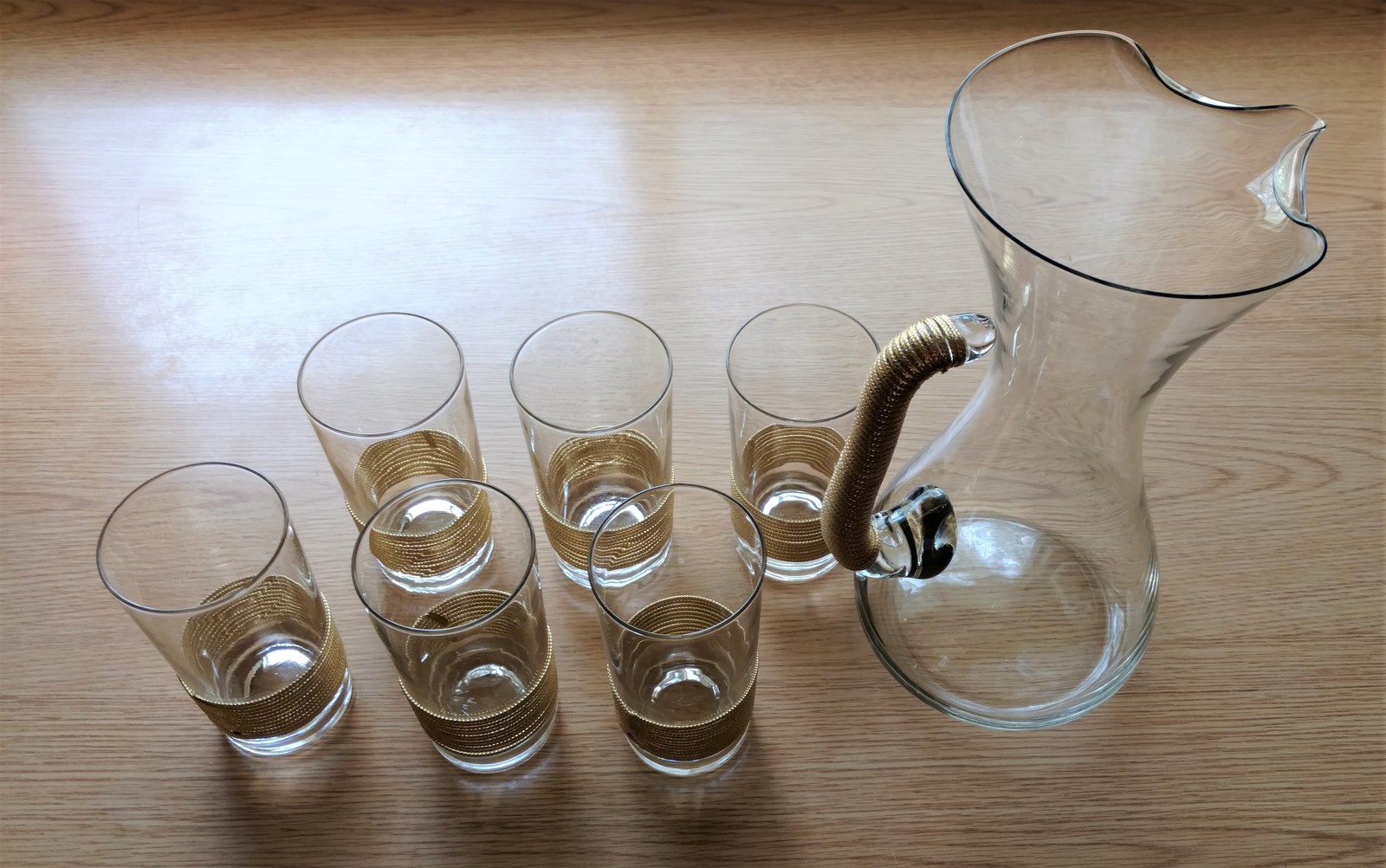 Vintage 1950's Glass Water Pitcher with Gold Cord Wrapped Handle and six (6) Matching Glasses