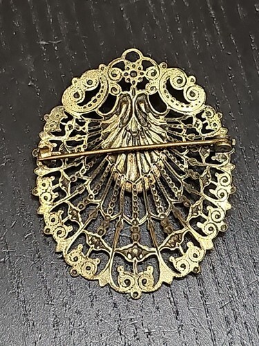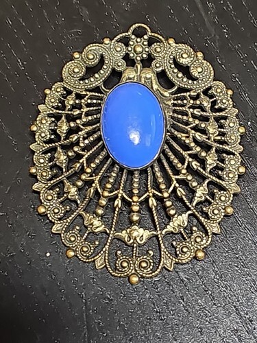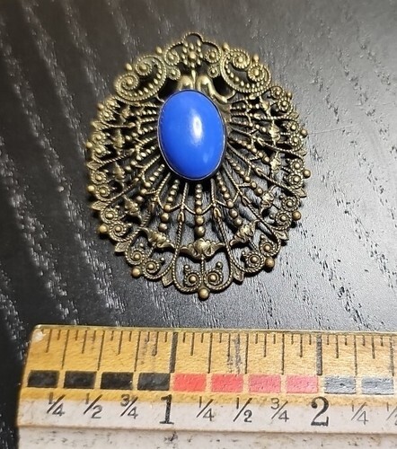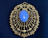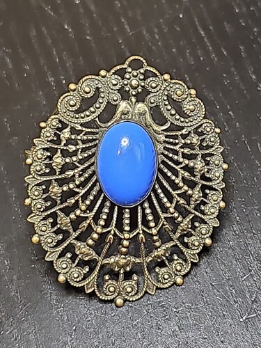 - Vintage Czech Filigree Gold Tone Blue Opaque Glass Center Cabochon Brooch Pin