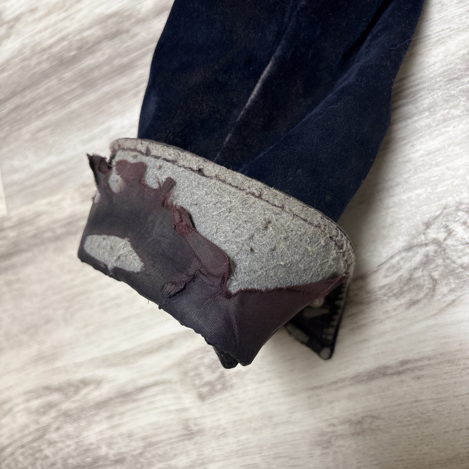 Worn in with marks, sun fade, holes/rips to the lining. Faux fur has compacted in spots. Velvet has wear to cuffs/elbows/collar/hems. Collar might be missing one stud. Snaps work great. Mild storage odors.