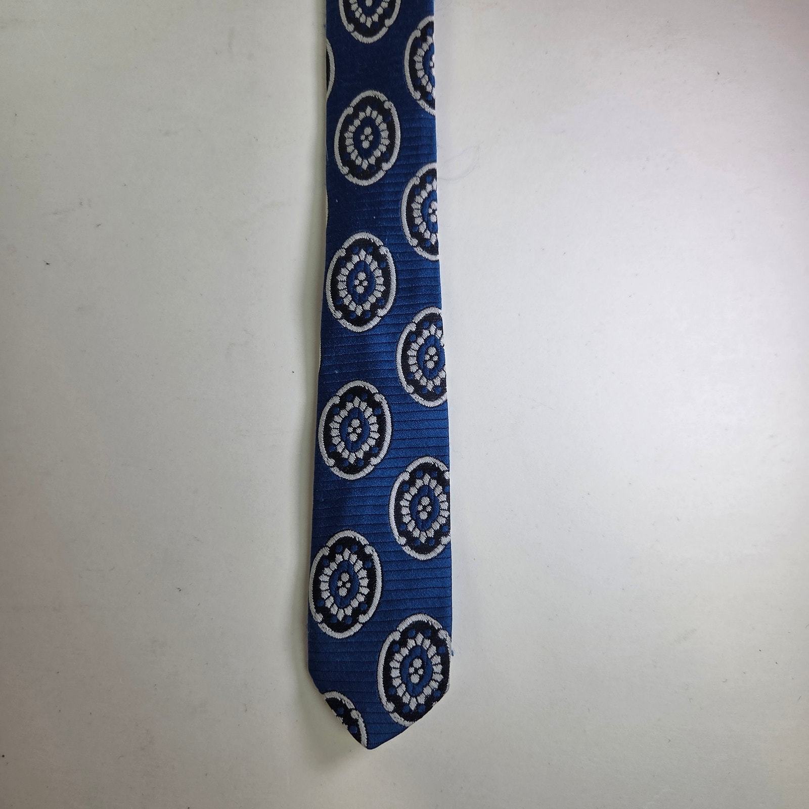 Stand out with this bold vintage tie from Dayton?s, featuring a repeating medallion pattern on a rich blue base. A great retro statement piece with wide 1970s?1980s proportions and timeless style.