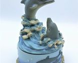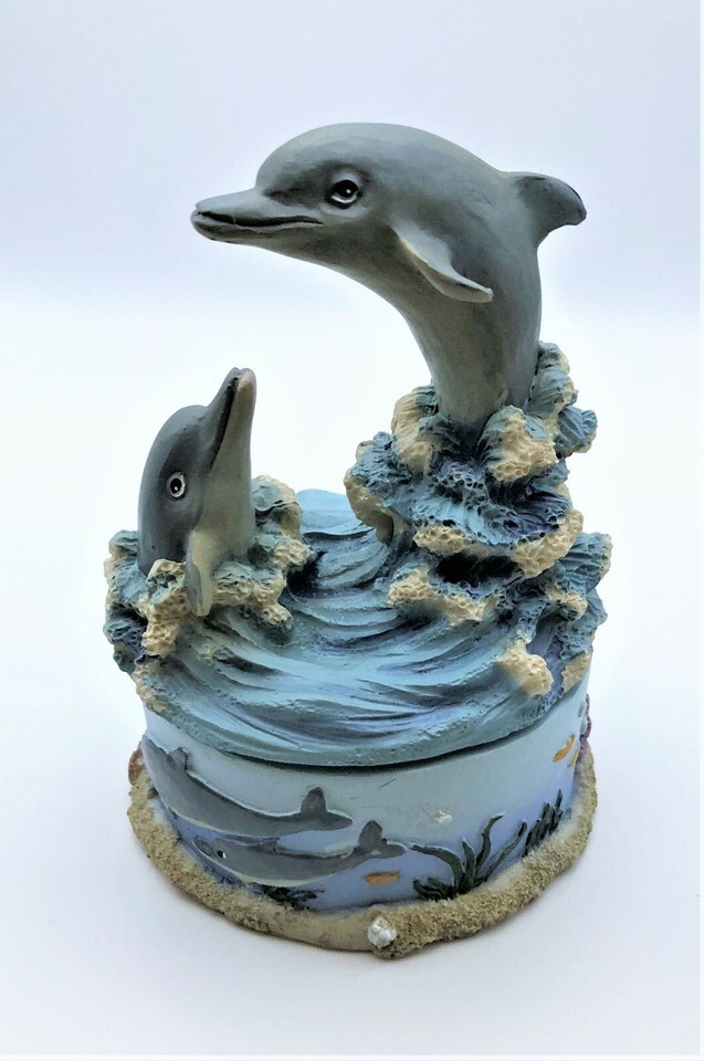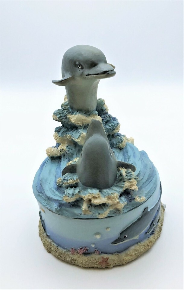 This dolphin figurine is around 5 inches in total height. The figurine is of two grey dolphins riding waves. It also has a small storage area for rings, jewelry or other small items. The item may have some minor scuffs due to the age as this was made in the 80's or 90's. I do offer calculated shipping in cart when you purchase