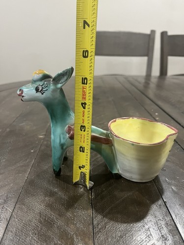 This vintage Italian planter features a charming donkey pulling cart design, crafted from high-quality majolica material. Made in Italy in the 1950s, this piece is a perfect addition to any decorative collection. The planter measures 5 1/2 inches in height and 8 inches in width, making it a great choice for displaying small flowers or plants. The donkey pattern and intricate details add a touch of whimsy to any space. This Italian ceramics planter is signed and boasts a style that is both classic and unique. A must-have for collectors of vintage decorative pieces.