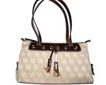 - Vintage Dooney & Bourke Tassel Zip-Top Monogram Canvas Leather Shoulder Bag Tan