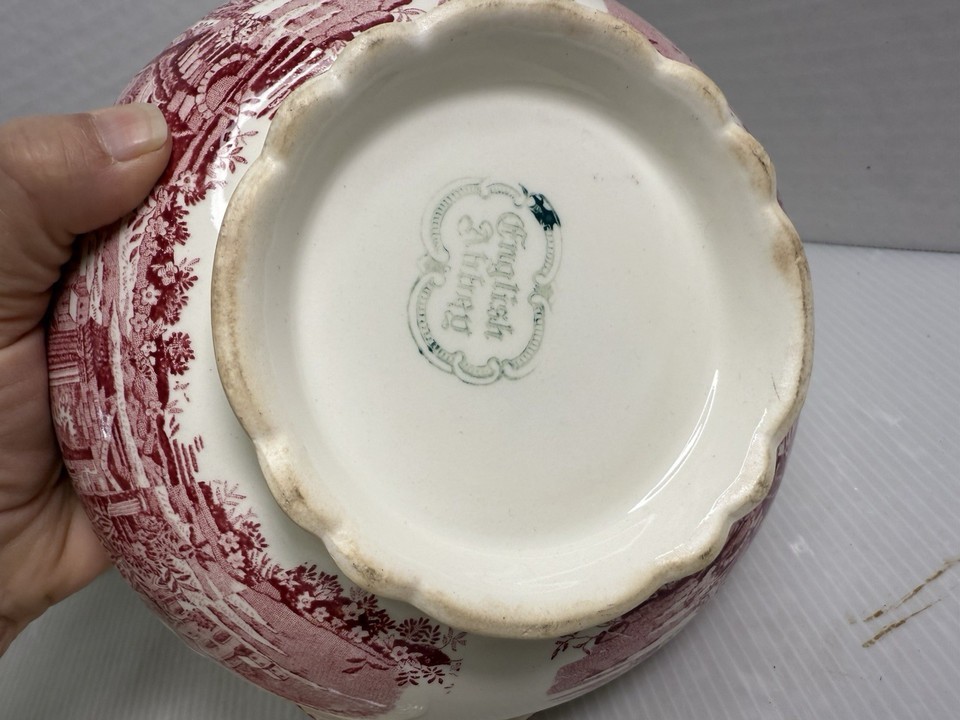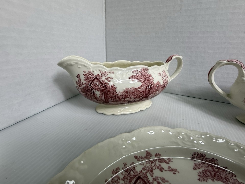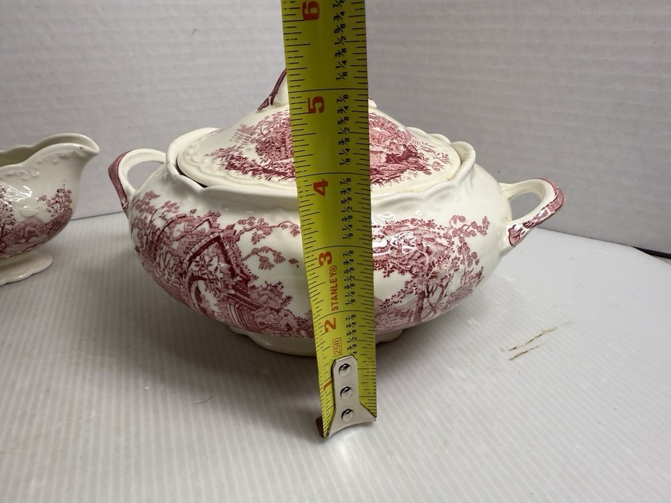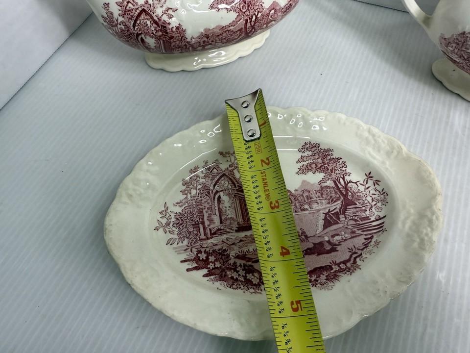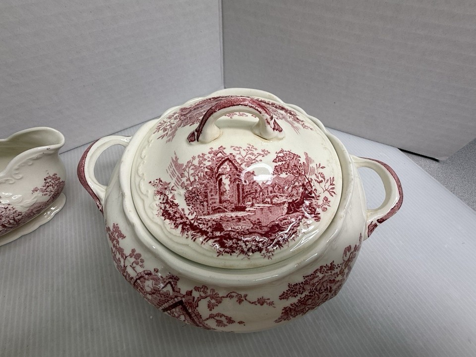 Add a touch of vintage charm to your table with this beautiful set of two English Abbey gravy bowls. Soup bowl with lid and small oval serving tray. The rich red transfer ware pattern is perfect for all occasions and the round shape is both elegant and practical. Made of high-quality china, these pieces are sure to impress your guests. The set includes a sugar bowl and lid, making it perfect for serving soup and other dishes. The backstamp is printed, adding to the overall beauty of the set. Don't miss out on this vintage treasure! Comes with no chips or cracks. See all pictures far condition.