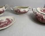 - Vintage ENGLISH ABBEY Red Transfer Ware two Gravy Bowls, soup, one small Tray