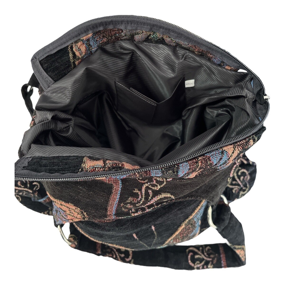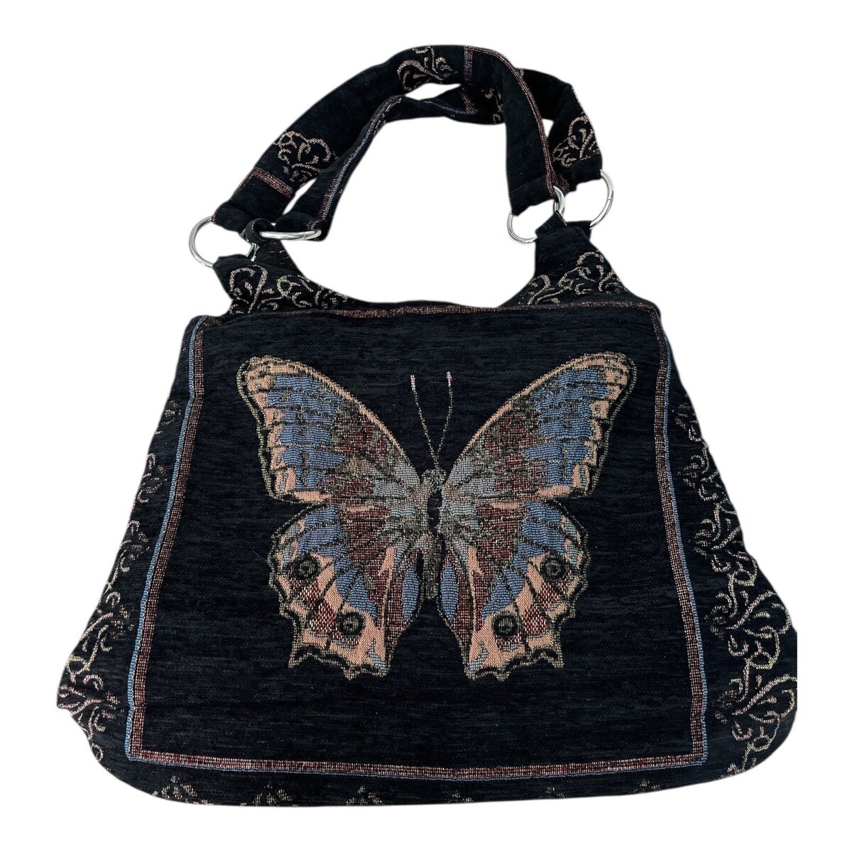 Charming early 2000s boho velvet tote bag featuring a large butterfly design embellished with multicolor sequins and beads. The bag?s tapestry-style fabric showcases rich black and bronze tones with a detailed border pattern. Both sides display butterfly artwork?one side accented with vibrant beads and sequins, the other woven in coordinating metallic thread. Fully lined with a black interior and zip closure, this piece perfectly captures the eclectic Y2K bohemian aesthetic.