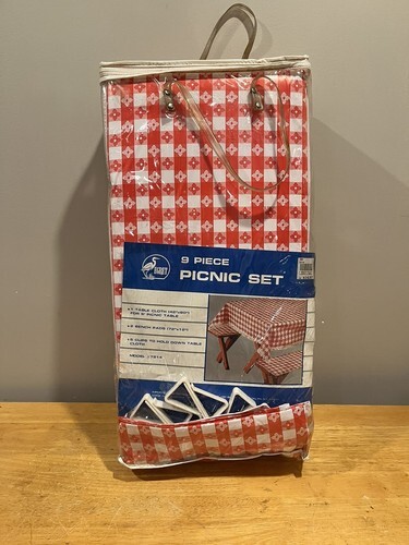 - Vintage Egret Picnic Table 9 Piece Cover Red Gingham Check Tablecloth Vinyl Pad