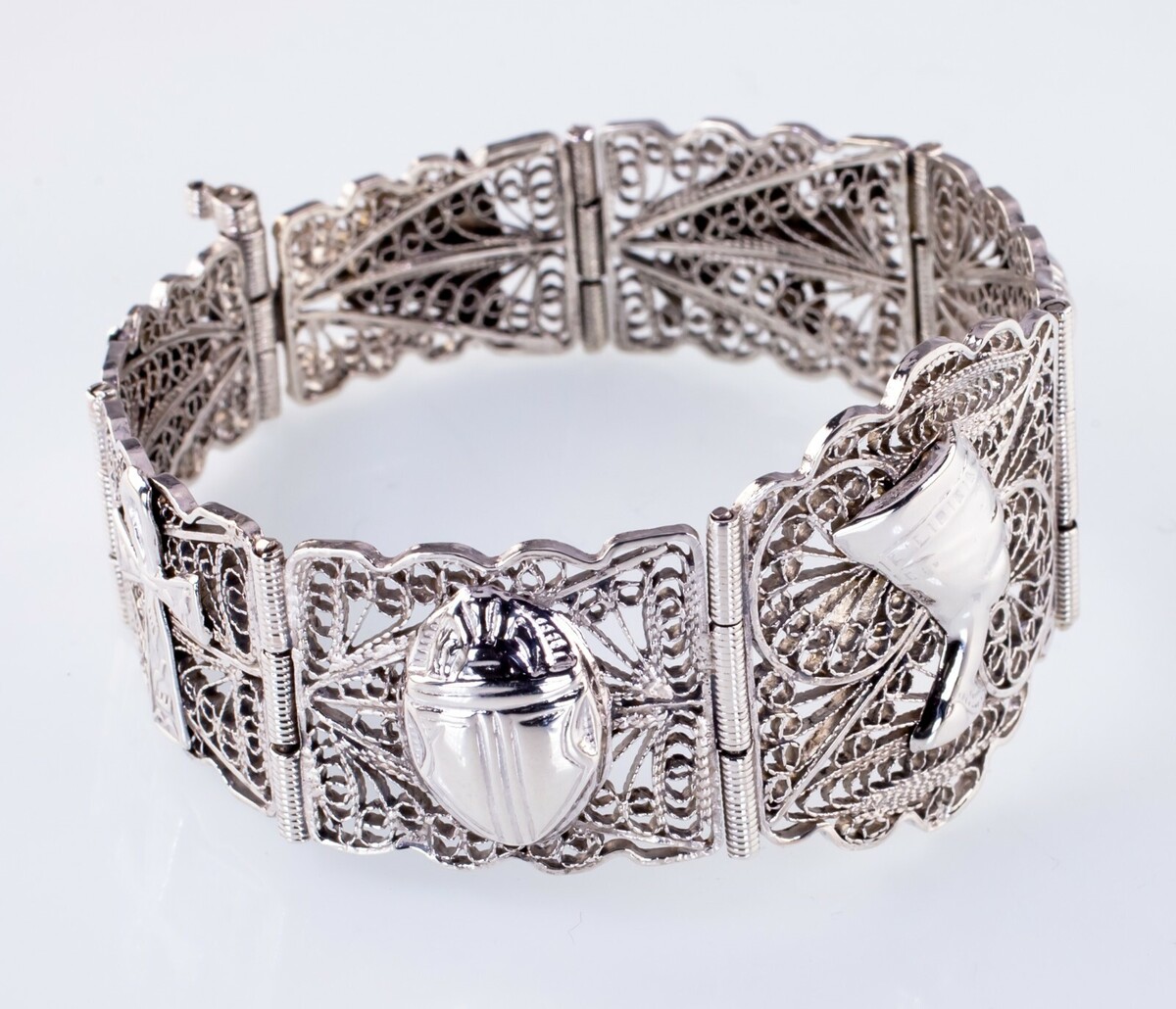 - Vintage Egyptian Silver Filigree Bracelet 7.75"