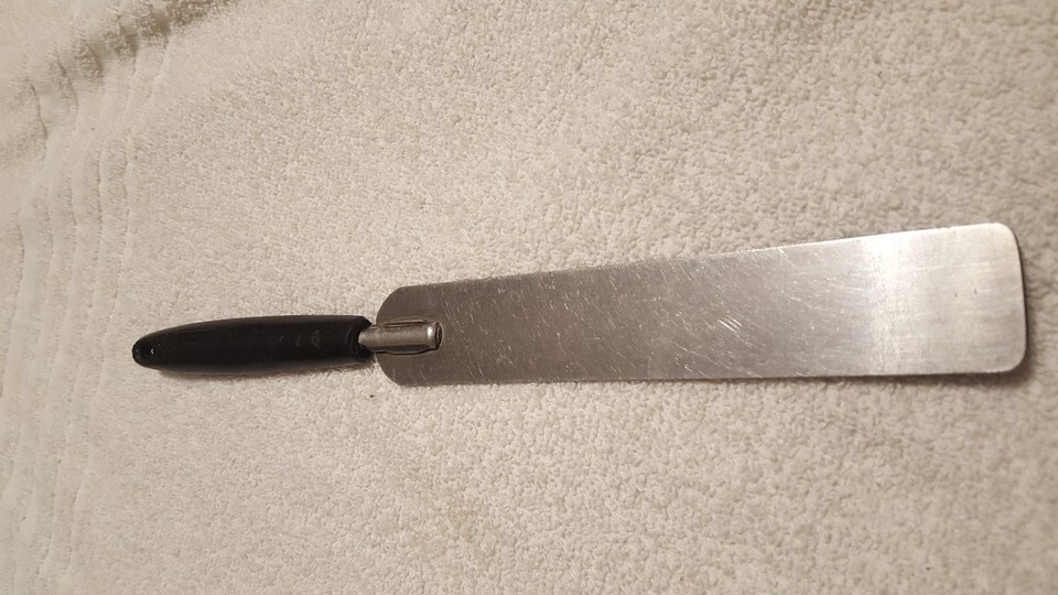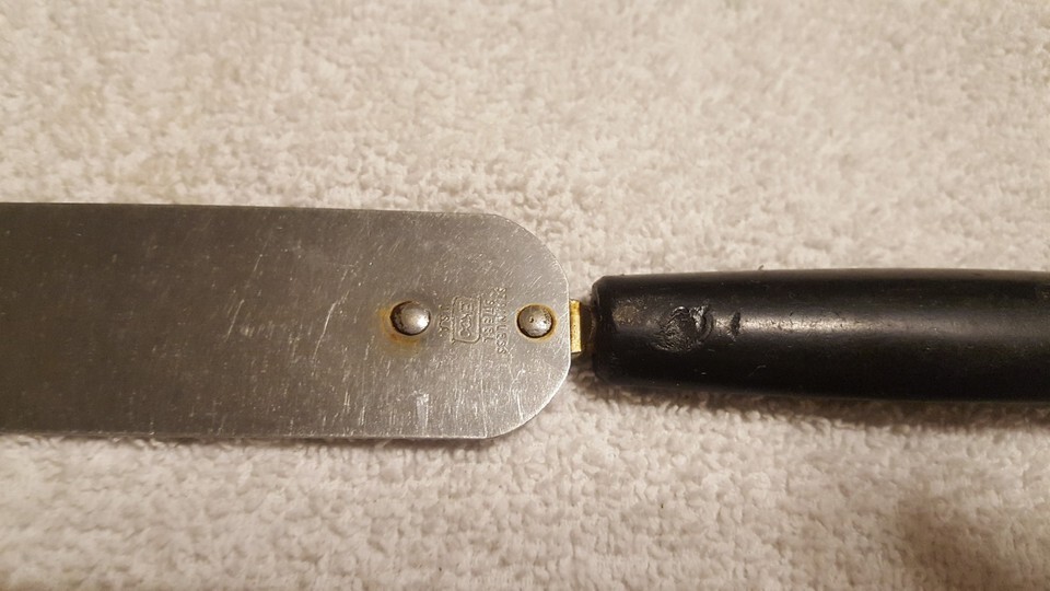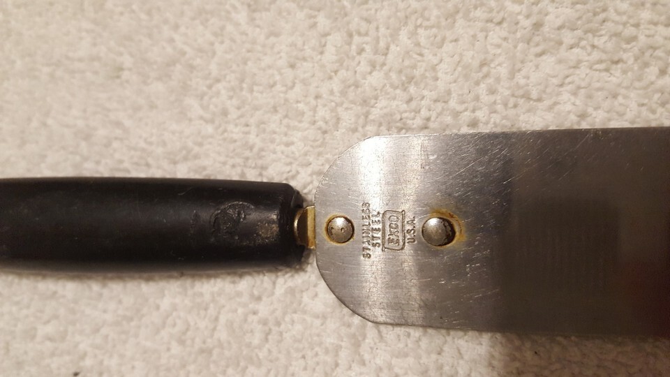 Vintage Ekco Stainless Steel Small Spatula, Cake, Icing Spreader. Black Handle. Some melting on bottom of handle, solid.