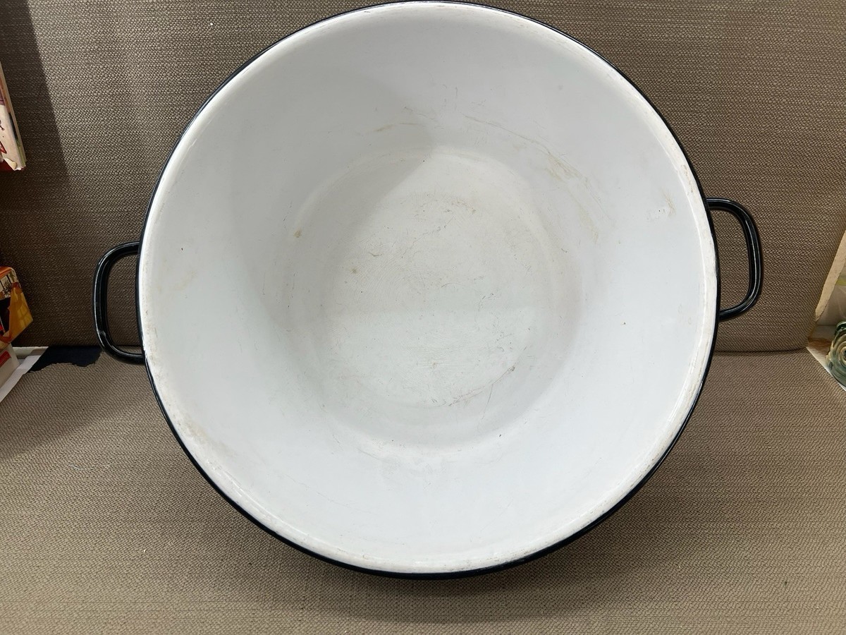 2860. Vintage Enamel Farmhouse Wash Basin Bowl White Black Trim Handles 14?