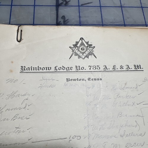 - Vintage Ephemera Rainbow Lodge 735 Masonic Newton Texas 1920s Roll / Dues Sheet