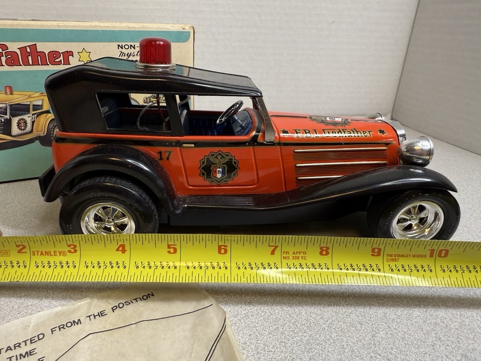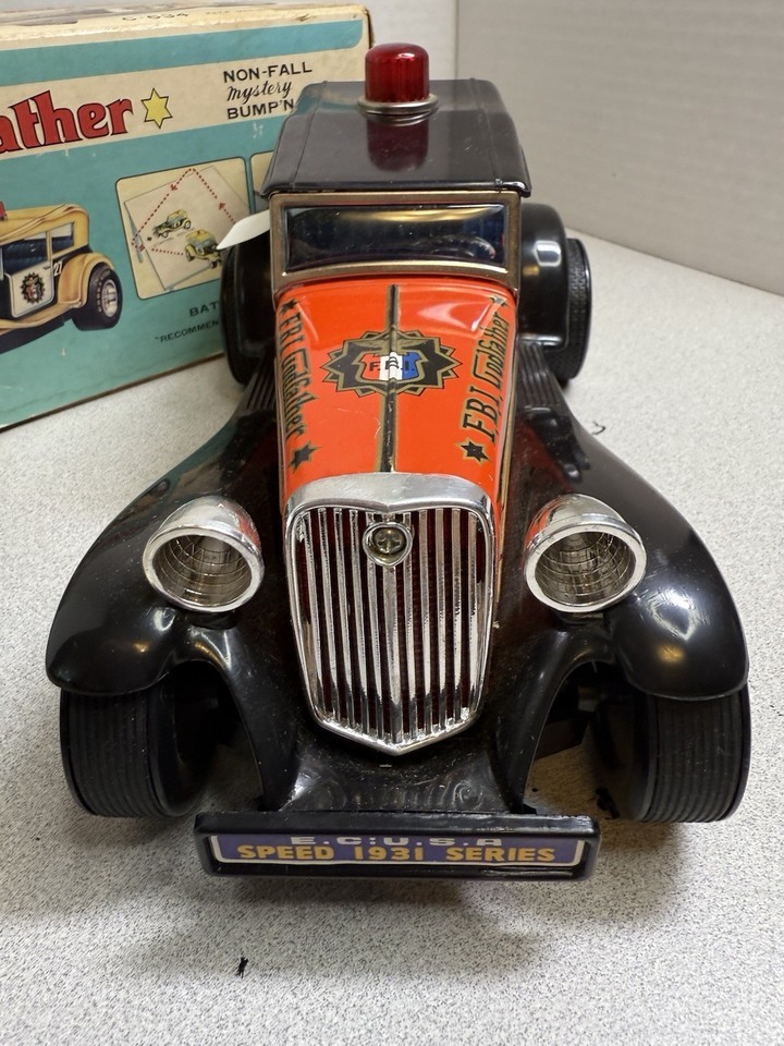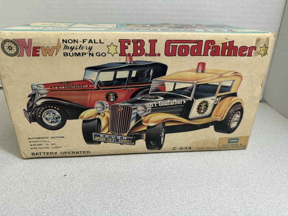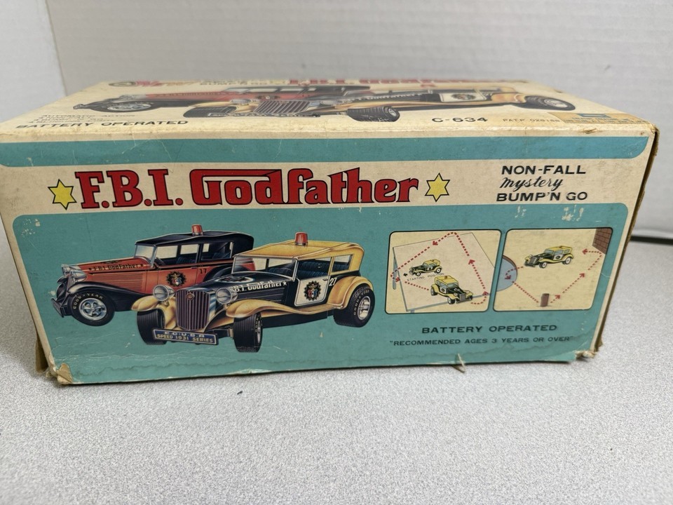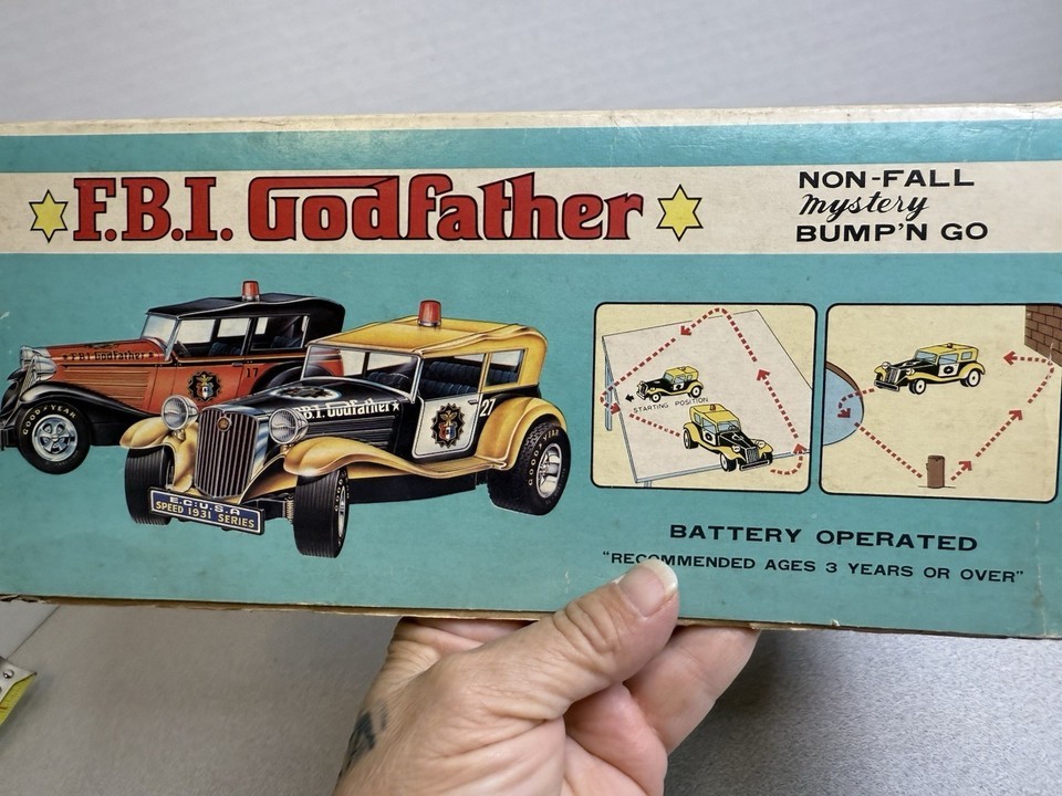 The Vintage FBI Godfather Bump N Go Car by TAIYO is a rare and sought-after toy car from the pre-1970 era. This electronic, battery-operated toy features a unique Bump N Go action, where the car moves forward and backward based on the position of the driver inside. The car comes in its original box, adding to its collectability and authenticity. Perfect for vintage toy collectors or fans of classic cars, this TAIYO bump N go car is a nostalgic piece that brings back memories of simpler times.