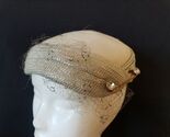 Evidence of puncture marks from the pearl bead hatpin (included). Original netting is missing with a few remnants attached to the silver wrap (left attached to match). Perfect for a bride or just a high fashion look!