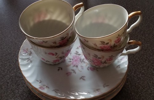 - Vintage ~ Four (4) Lefton China Luncheon Plates w/Matching Cups ~ Hand-Painted