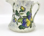 EUC, Excellent Used Condition. Vintage signed dated, 1958, Frank Flores speckled pitcher with purple yellow pansies. There are blue speckles on a white background with beautiful purple yellow pansies twining around the pitcher. It's almost too beautiful to use.