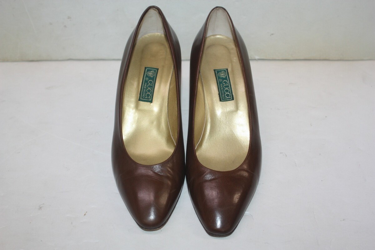 - Vintage GUCCI Brown Calfskin Leather Gold GG Logo Pump Heels Size 36.5 / 6.5 US