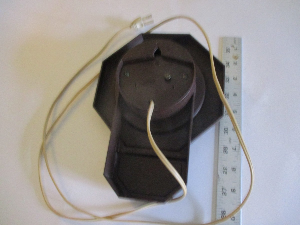 THE CLOCK IS 9" X 7" WITH A LONG ELECTRIC CORD FOR EASE OF USE; IT SAYS GENERAL ELECTRIC ON FRONT ON BACK SAYS: MODEL 2128 A, VOLTS 115, 60 CYC W2; ASHLAND, MASS, MADE IN U.S.A.