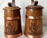Vintage German Zodiac Wooden Beer Steins Aquarius & Scorpio Copper Trim Lidded