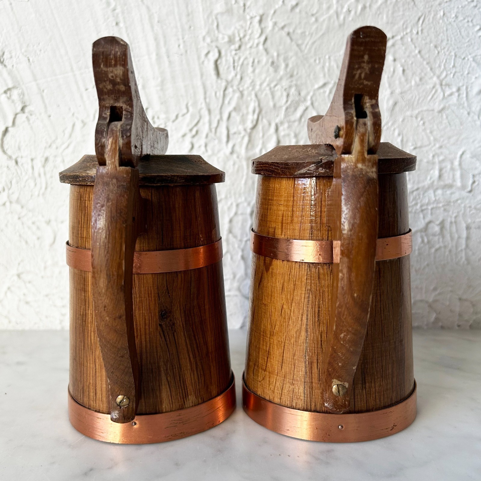 Add rustic charm and astrological flair to your decor with this pair of vintage German wooden beer steins featuring zodiac carvings for Wassermann (Aquarius) and Skorpion (Scorpio). Each stein is handcrafted from warm-toned wood with engraved zodiac imagery, accented by copper bands and wooden hinged lids.
