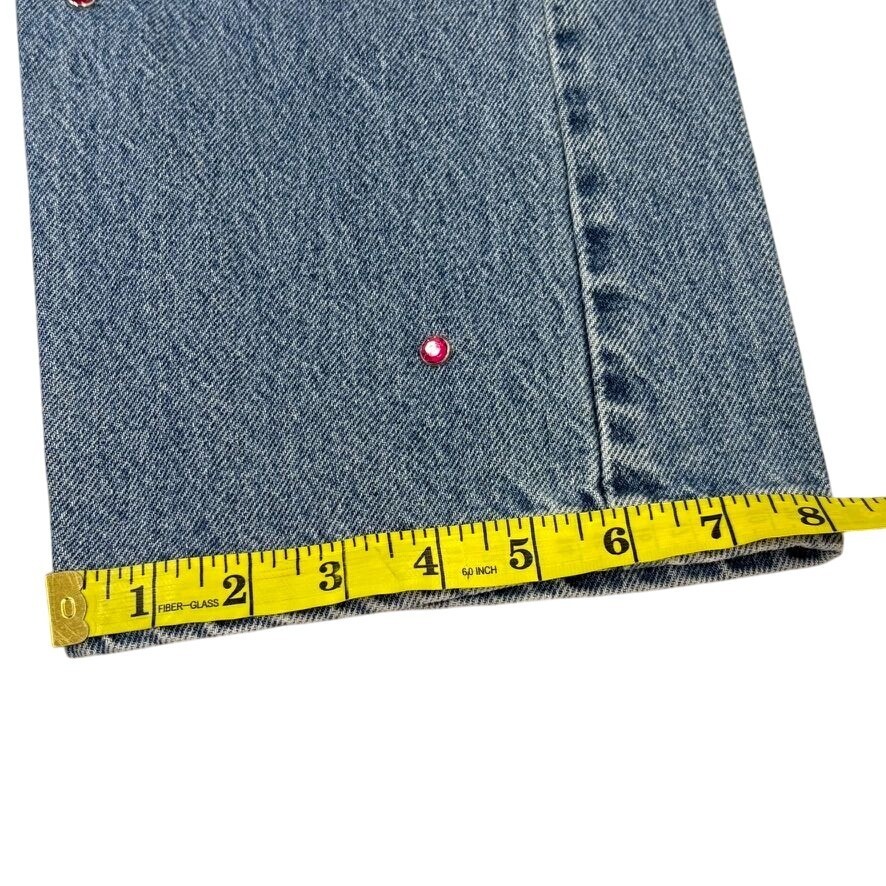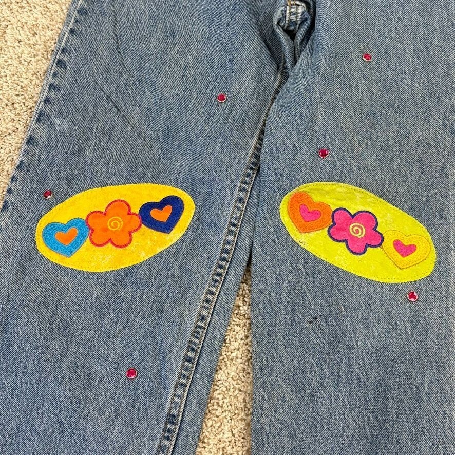 - Vintage Girls Embellished Blue Denim Jeans W/ Heart & Flower Patches Funky Y2K