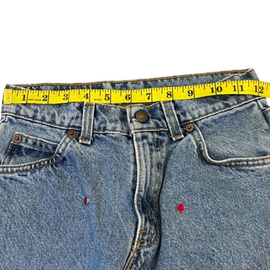 Faint stains on the right leg and minor wear on the fabric. Waist = 12 inches, Rise = 9 inches, Inseam = 26 inches, Leg opening = 6 inches.