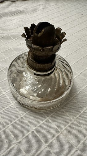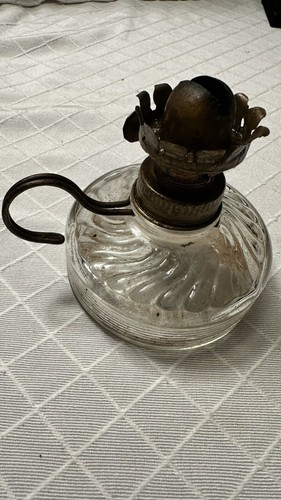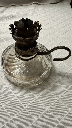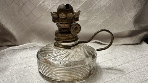 The vintage glass finger oil lamp is small in size with a clear color and oiled finish. It features a brass finger ring for easy carrying. The lamp is made of glass and is designed for use with oil as a power source. This lantern style lamp emits a warm and cozy light, perfect for adding a nostalgic touch to any space.