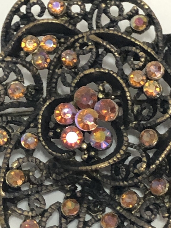 Vintage Gold Bronze Tone Flower Faux Pink Rhinestones Brooch Pin 1 3/4” Jewelry