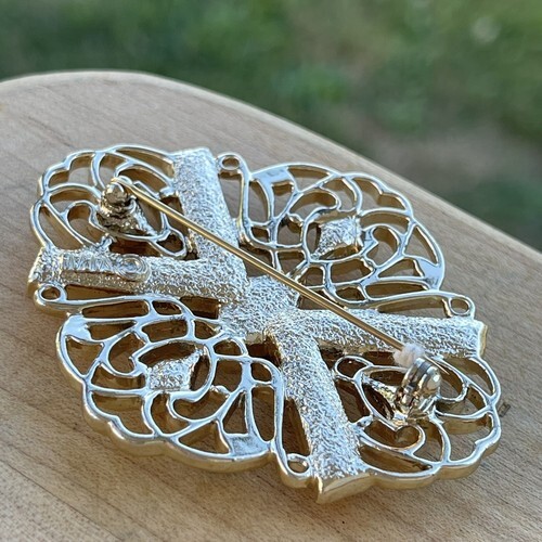 Vintage Gold Tone Brooch Pin Mesh Lucite Rhinestones Coral Peachy