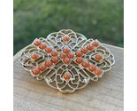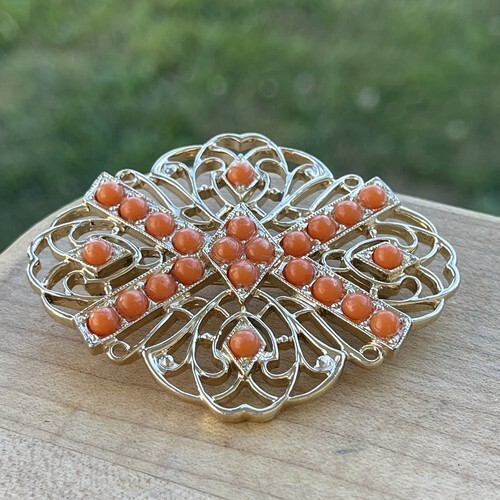 - Vintage Gold Tone Brooch Pin Mesh Lucite Stones Coral Peachy Fashion Jewelry