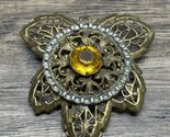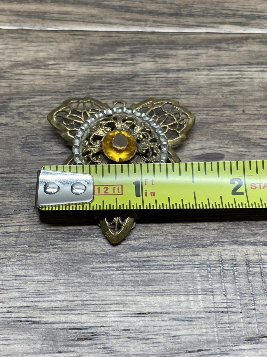 Good, wearable condition. Clasp is a hinge, but is tight. Has a prong to wear as a pendant. Unsure of what the yellow bead/stone is made of. Please see pictures for condition details and measurements.