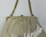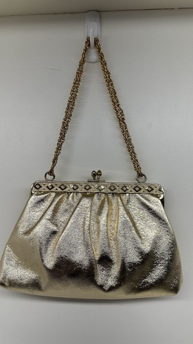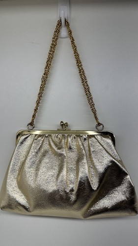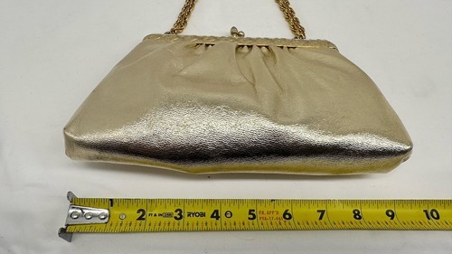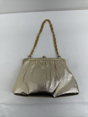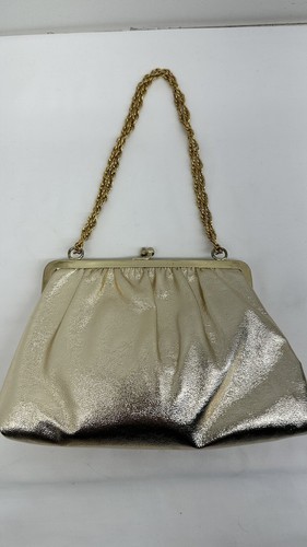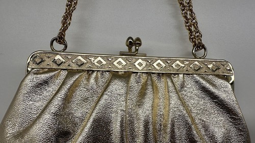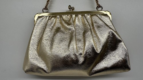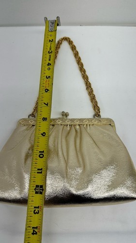 Elevate your evening look with this vintage golden metallic shimmer top handle bag. The solid pattern and small size make it a perfect accessory for any formal occasion. The clasp closure and metal hardware, including the gold handle/strap and finish, add an extra touch of elegance.