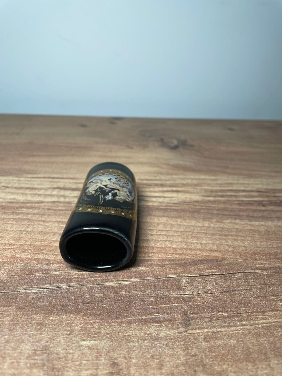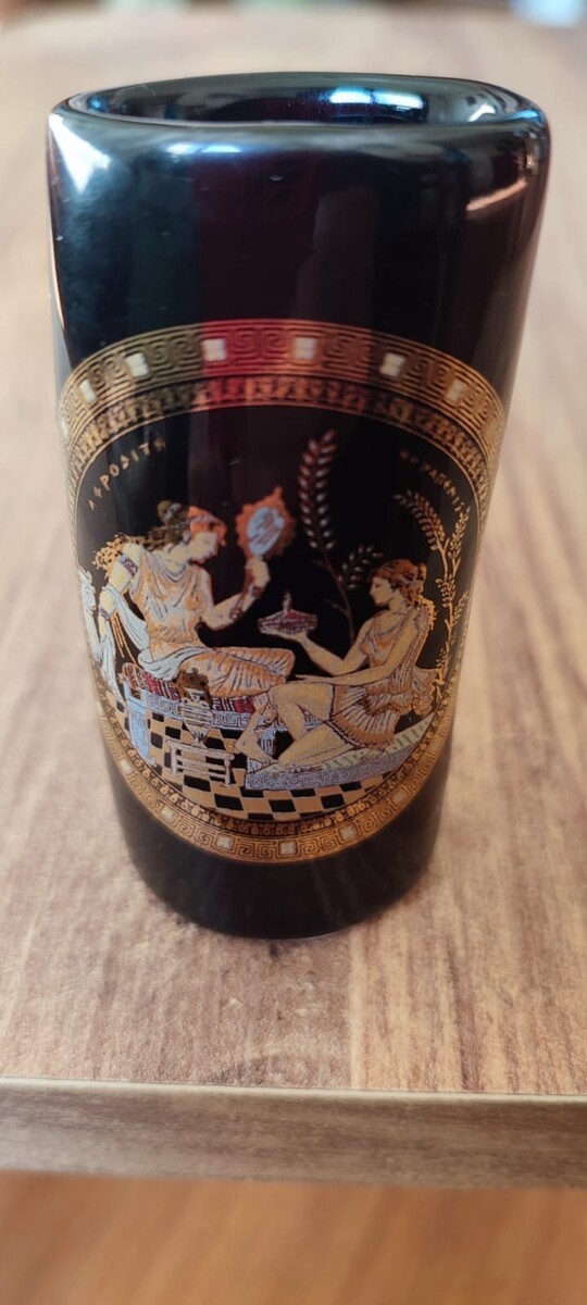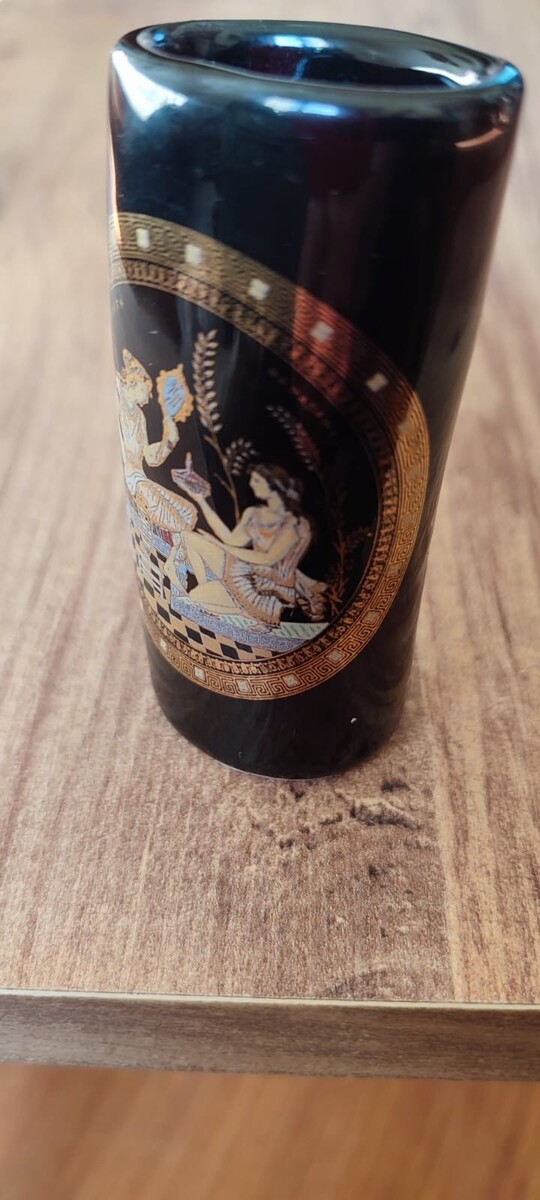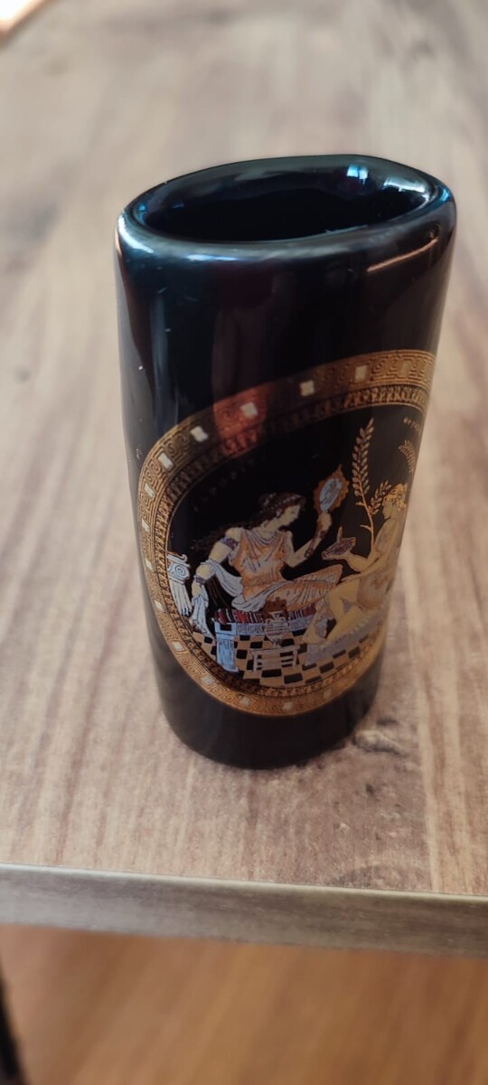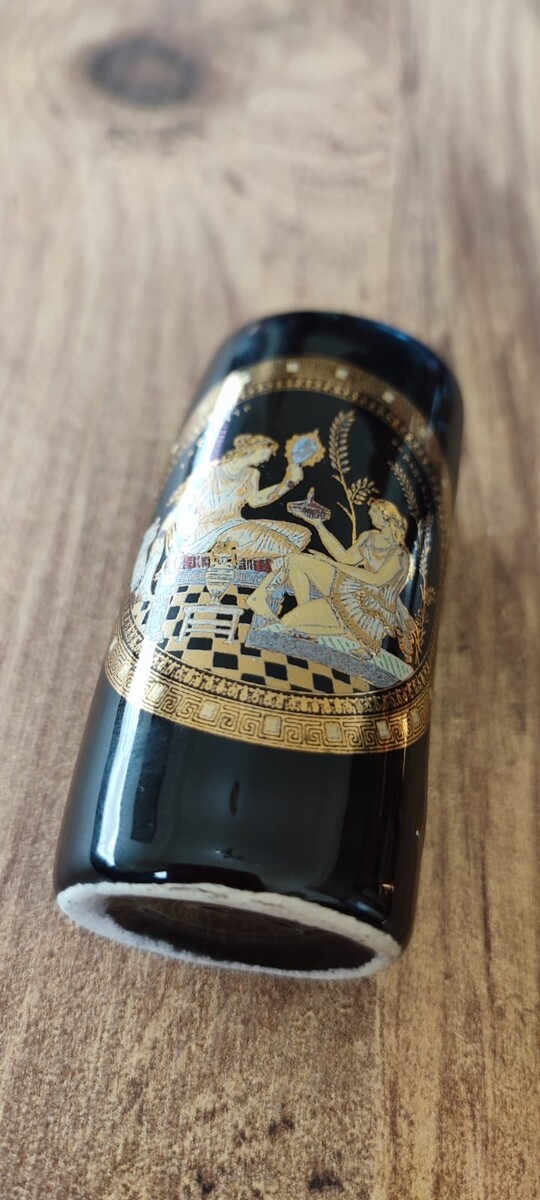 - Vintage Greek Ceramic Lighter Holder or Mini Vase – Black & Gold Mythological