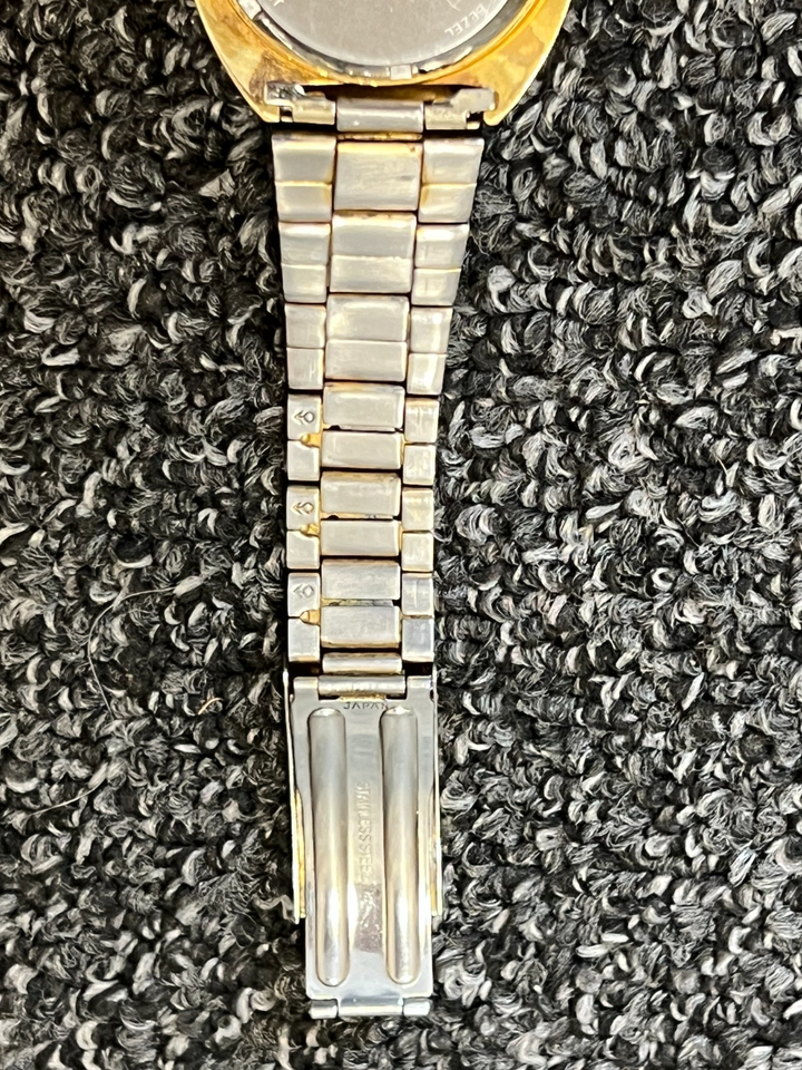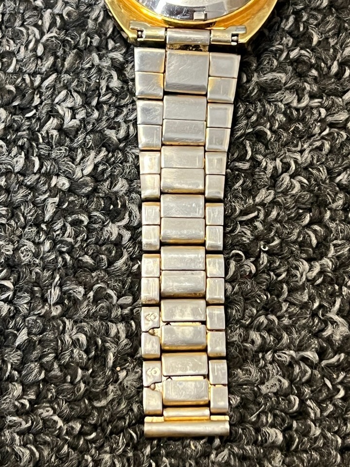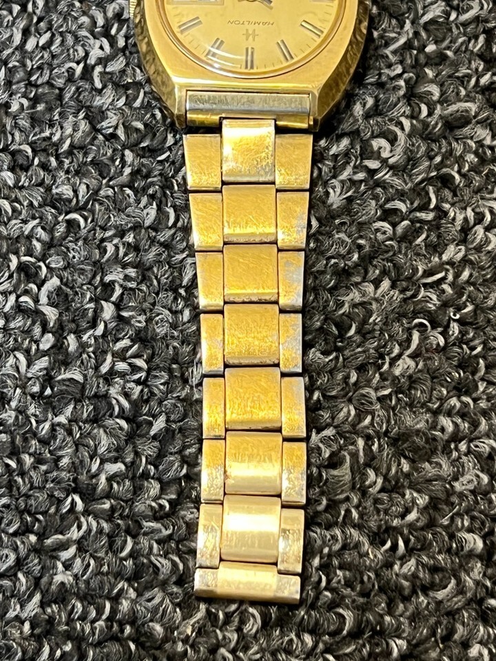The item for sale is a vintage Men's HAMILTON Electronic Watch 702009-4 Gold Plated Day/Date. This watch was a storage unit find. In good used condition with age-related wear. The stem clicks out in two steps and I'm able to set the time fine, but it's not running and most likely needs a battery. The bracelet is heavily worn and missing quite a bit of plating, but the watch case has retained its plating well. The crystal shows some scuffs and scratches.