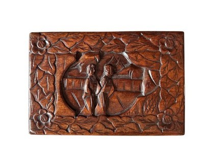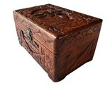 This beautiful box is ready to guard your treasures! Hand-carved with intricate Asian relief scenes and a lush floral border, this wooden chest is pure charm. Lift the lid to reveal a striking, vibrant red velvet interior?the perfect cushioned home for your jewelry, keepsakes, or secret stash of coins. Its a gorgeous piece of Oriental decor that brings a touch of vintage elegance to any dresser or shelf.