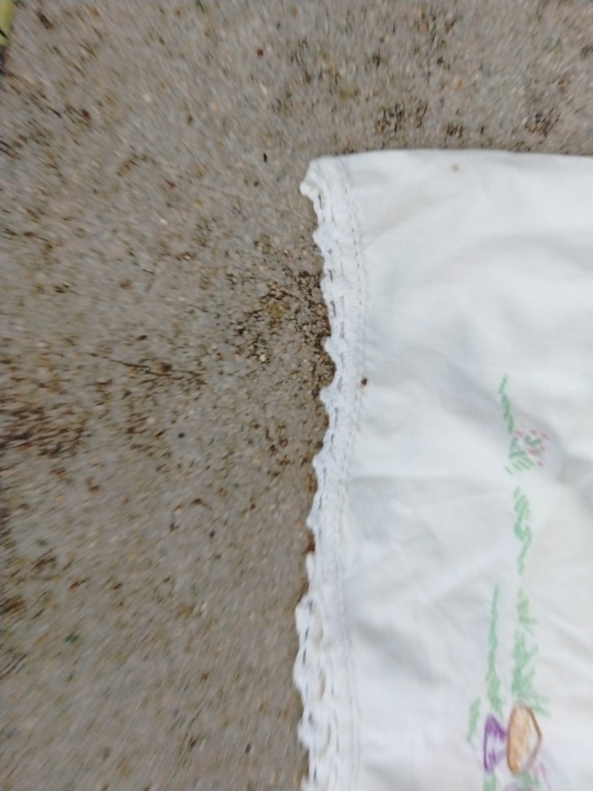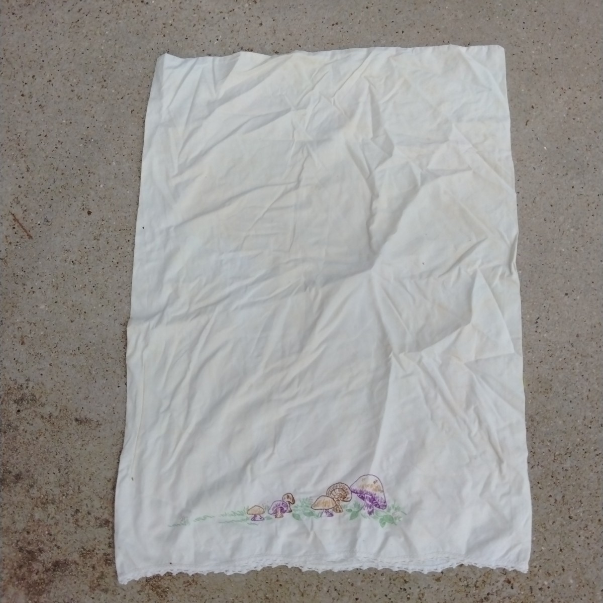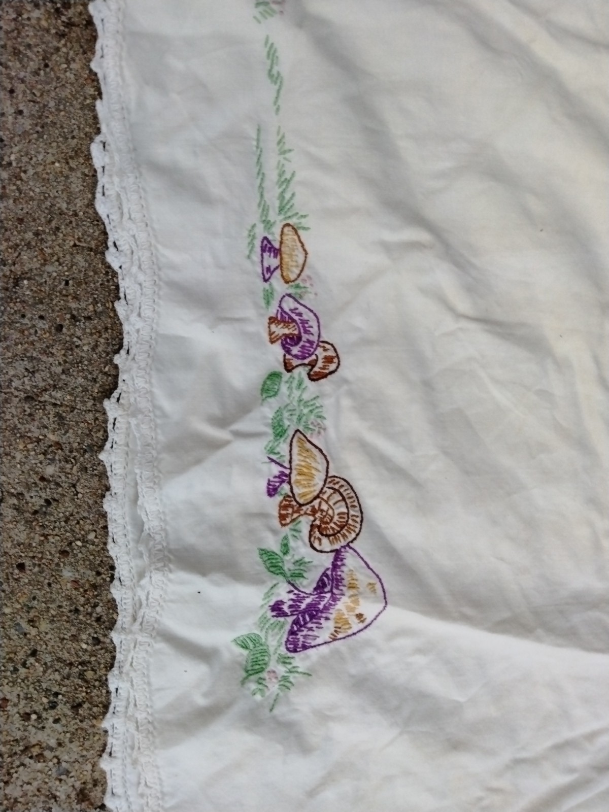 - Vintage Hand Embroidered standard Pillow Cases Mushrooms and Crochet lace