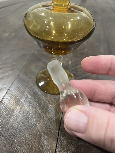 This vintage handblown amber vanity perfume bottle is a stunning addition to any collection. The bottle features a beautiful teardrop shaped stopper in clear glass, adding an elegant touch to its overall appearance.