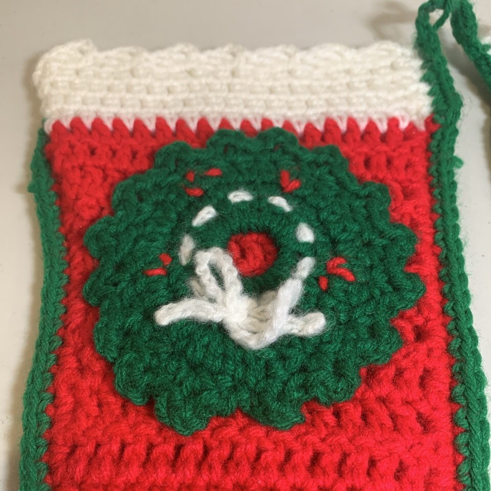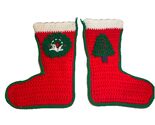 - Vintage Handmade Crochet Christmas Stockings Pair Wreath Tree Red Green 16in