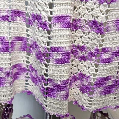 Add a touch of vintage charm to your kitchen or craft collection with this beautifully handmade crocheted apron.?Crafted with care in soft white cotton yarn accented with lavender and purple stripes, this half apron combines a delicate lace pattern with a touch of farmhouse nostalgia. Perfect for cooking, display, or as a unique gift for lovers of handmade treasures.